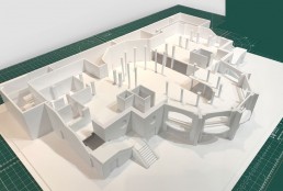‘Mill Lane’ is a 1:50 scale model of a proposed major refurbishment and extension project. The model was developed from a set of simple architectural sketches and some basic ground measurements. Made from foam-core, each of the 3 floors are removable showing individual room layouts. All roof areas are removable allowing for internal floor layout and planning.